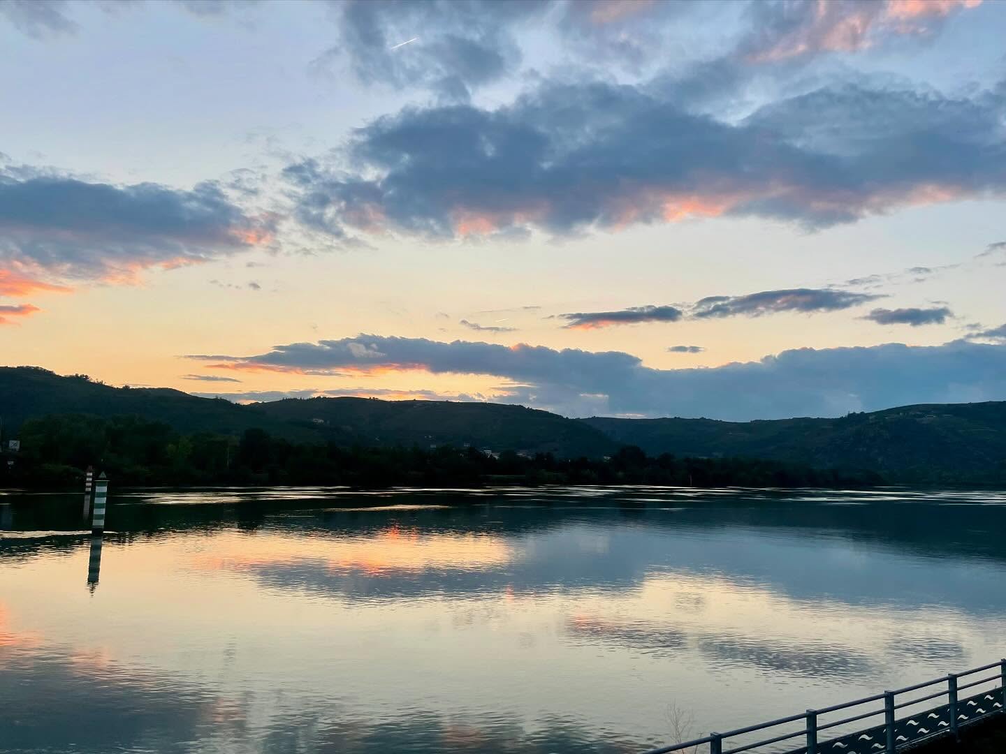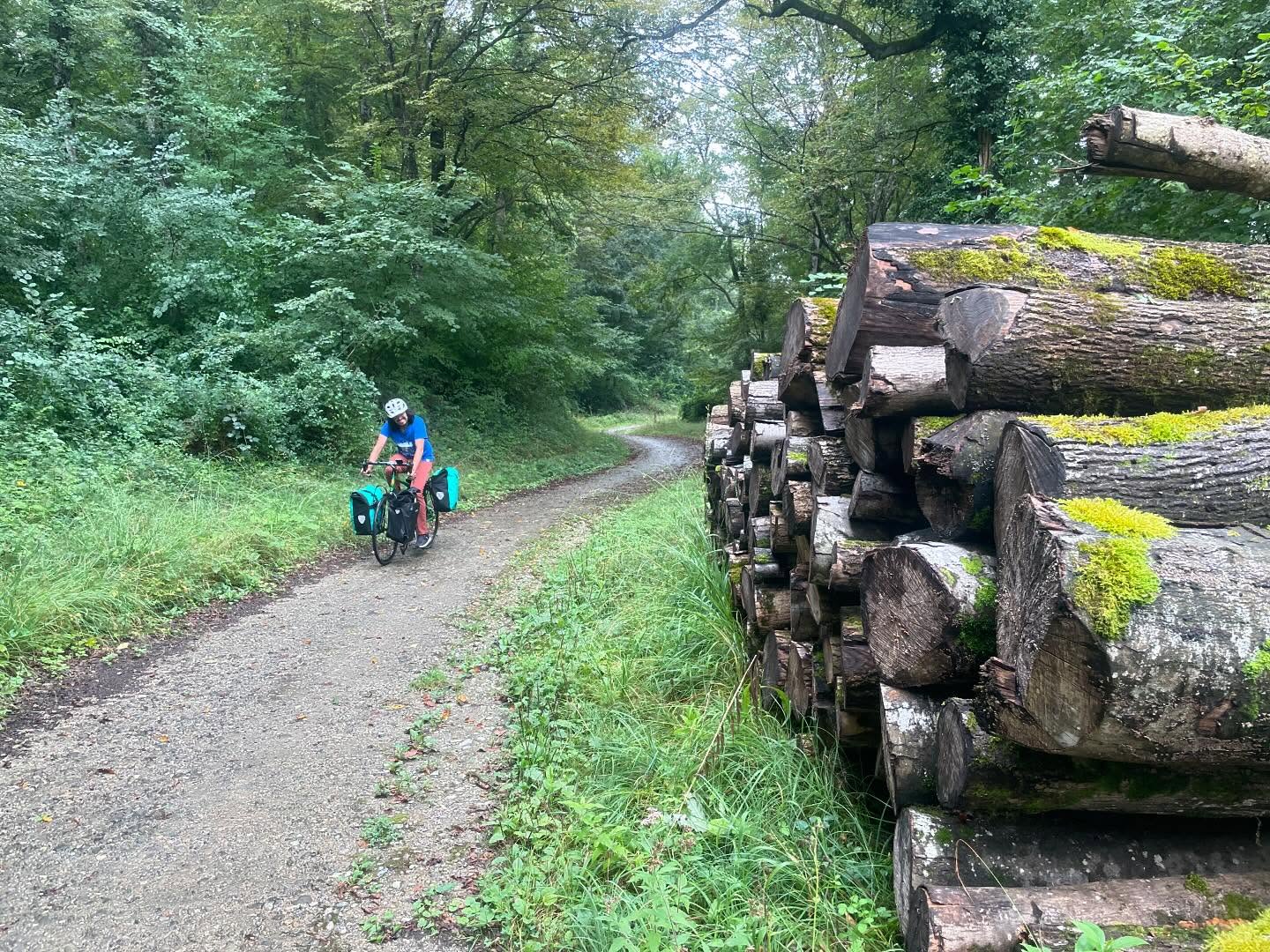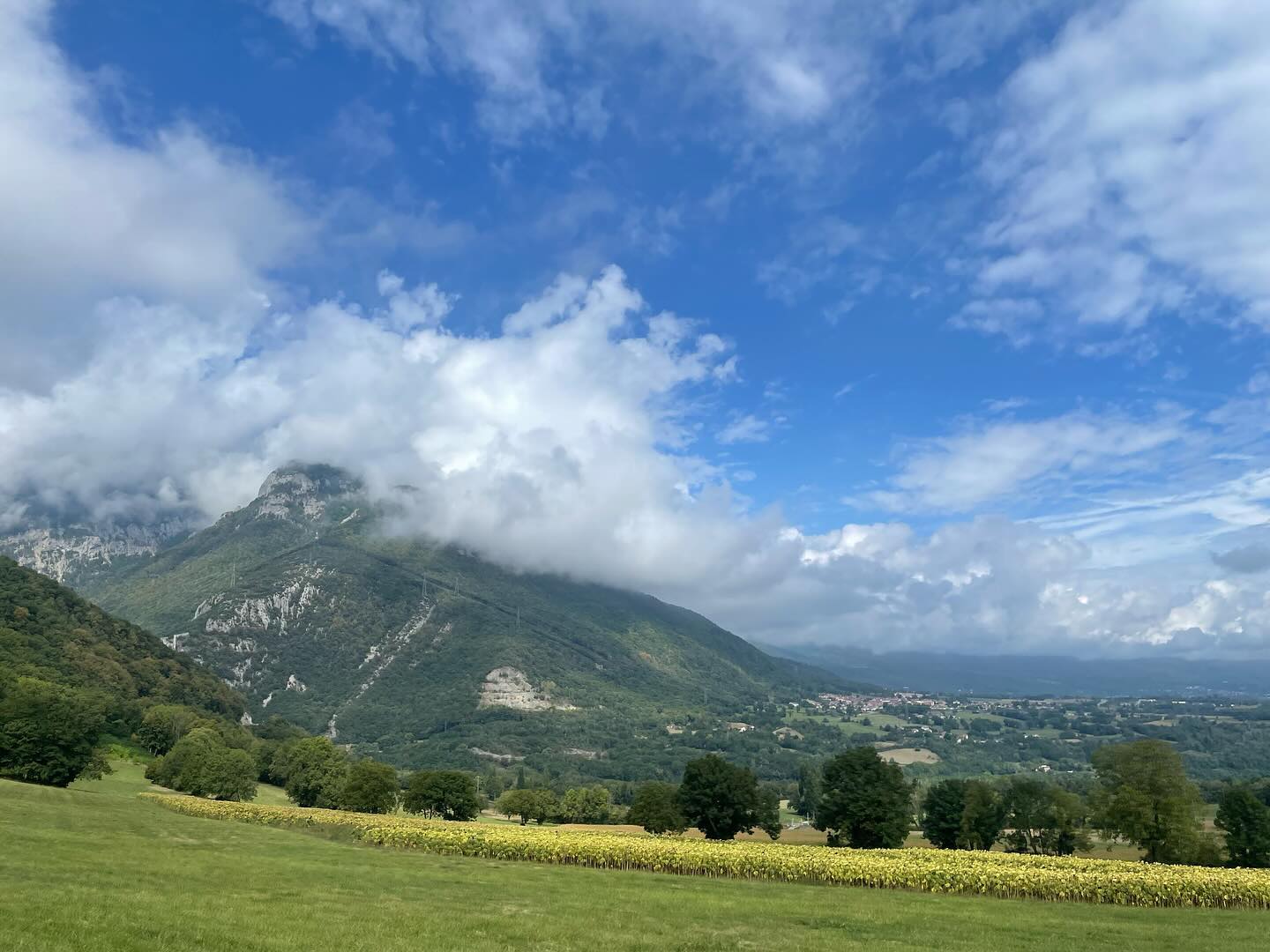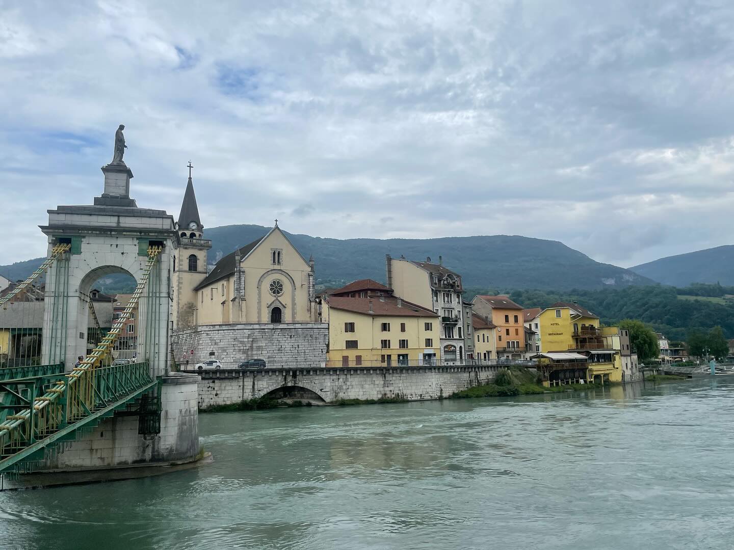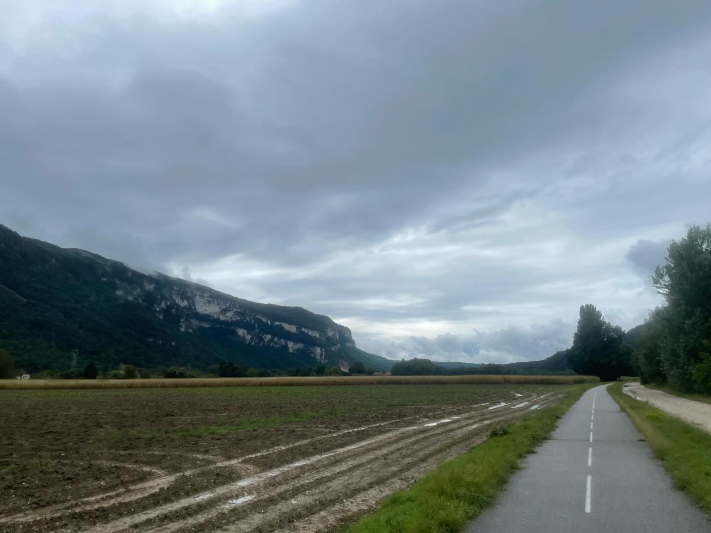 Spain aside, the rain in France fell mainly on us. After an hour biking through a downpour, we found a cafe in Belley to wait out the rain. Then we got lost on the way to Morestel, and had to ride a rough gravel road to get back to the trail. After Morestel, Ranjan did a front flip over a barrier (somehow he was fine). And when we got to our campsite at sunset, we found the office had closed 30 minutes ago. Nevertheless, the scenery is beautiful and the people are very kind. We found a hotel north of Montelieu-Vercieu, which served the best meal of the trip so far.