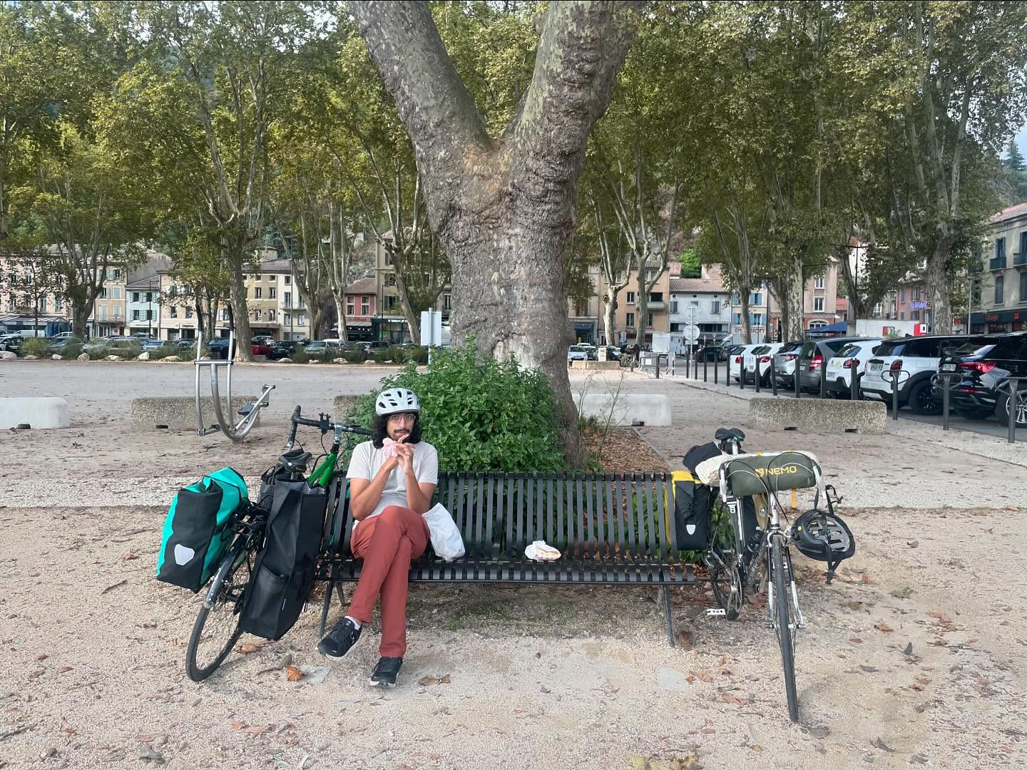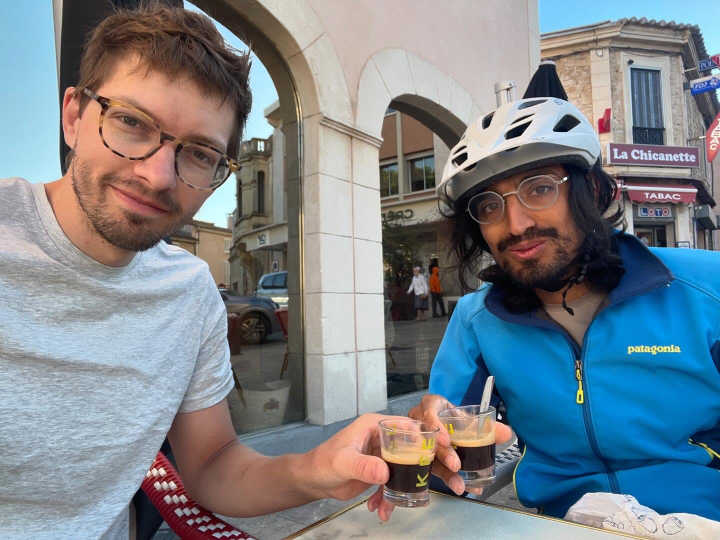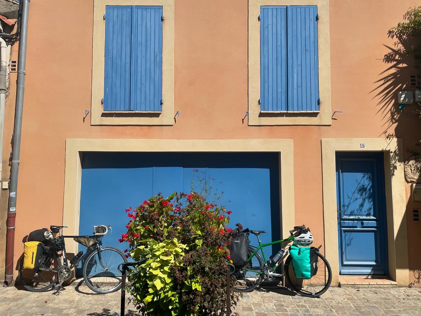 Friday we battled gusty crosswinds from Avignon to Saint-Gilles. Ranjan got a flat when I was too far ahead, but got help from another traveler. In Saint-Gilles the bartender at the local bar looked exactly like Freddie Mercury. We didn’t hear him sing. Saturday we had lunch in Aigues-Mortes, a little walled city with lots of touristy shops. I wonder what crumbling aspects of American towns will seem so cute in a thousand years. At Le Grande-Motte we stopped to take a dip in the Med. In the afternoon we reached Montpellier, had some duck breast with foie gras, and had a long rest.