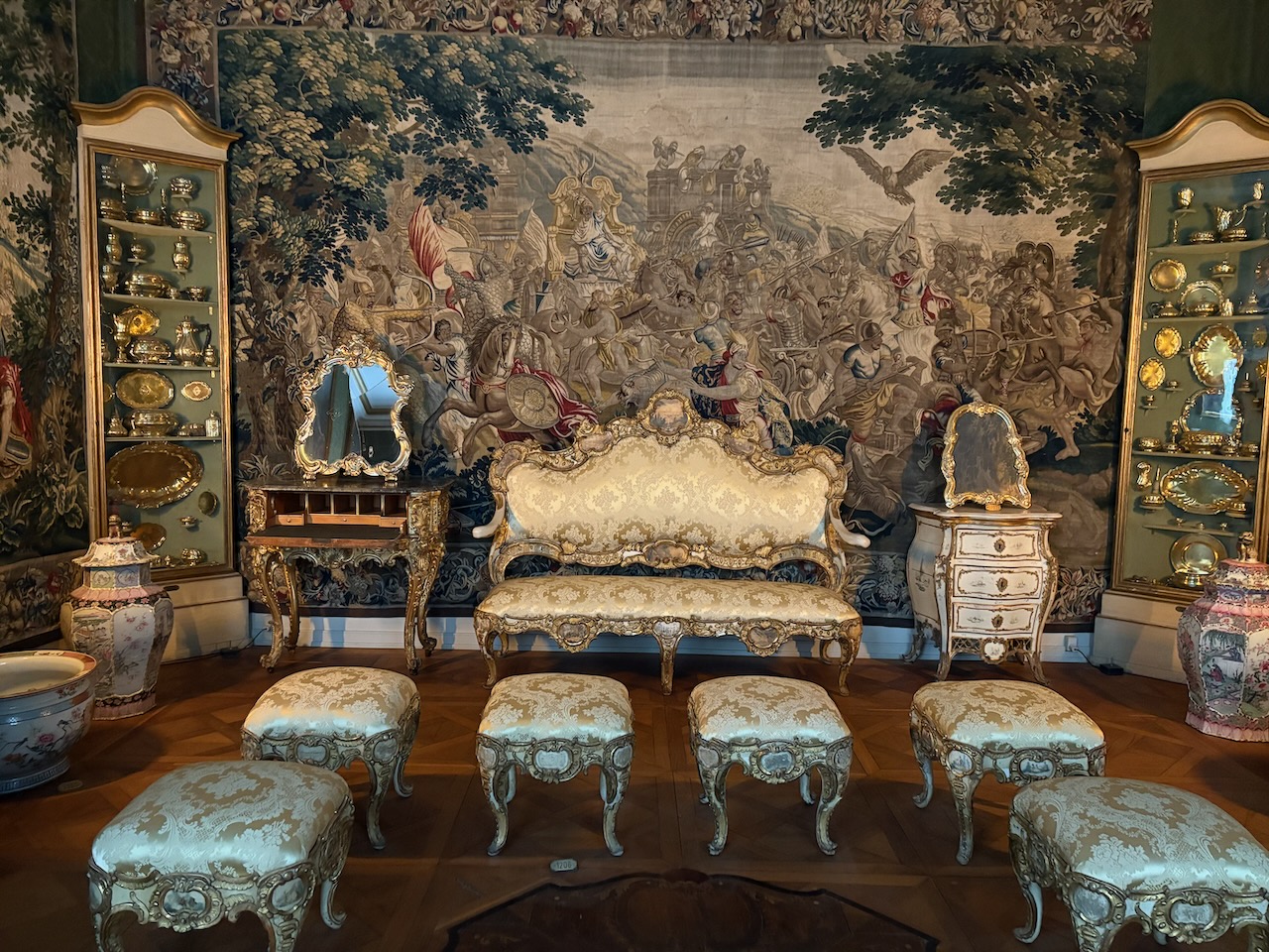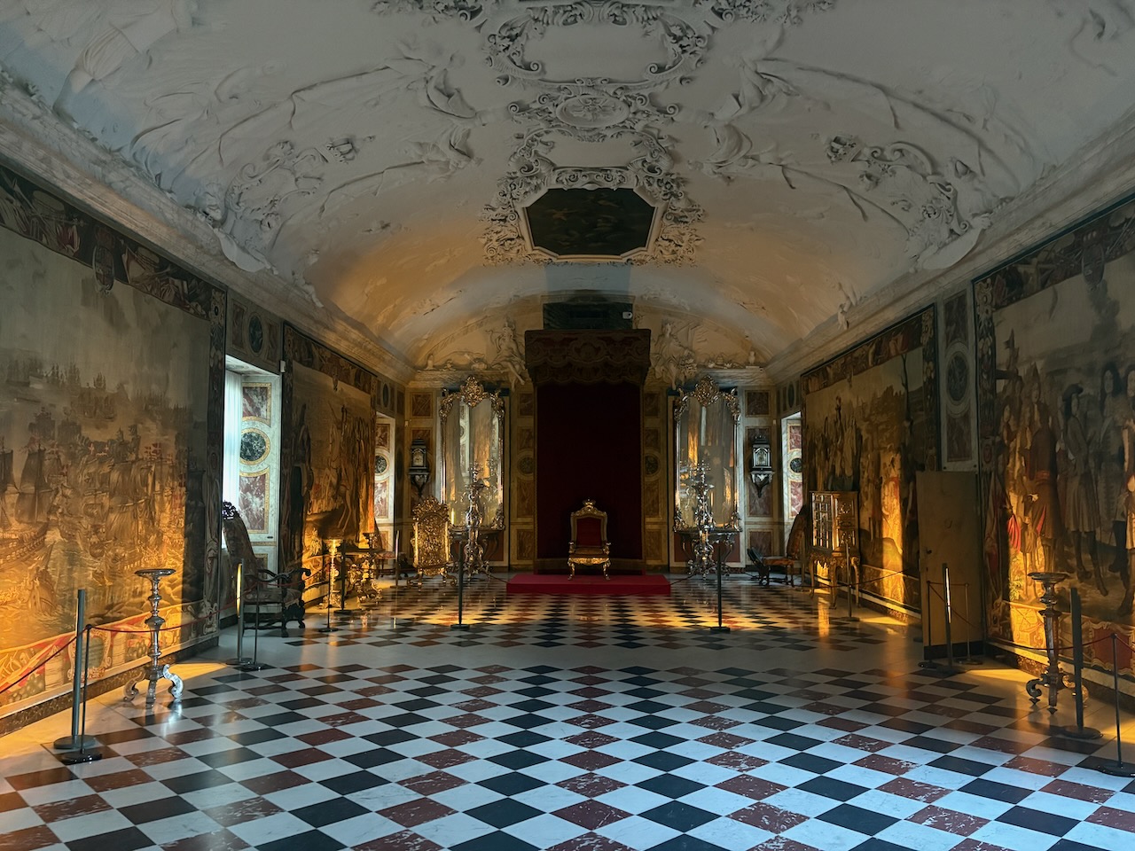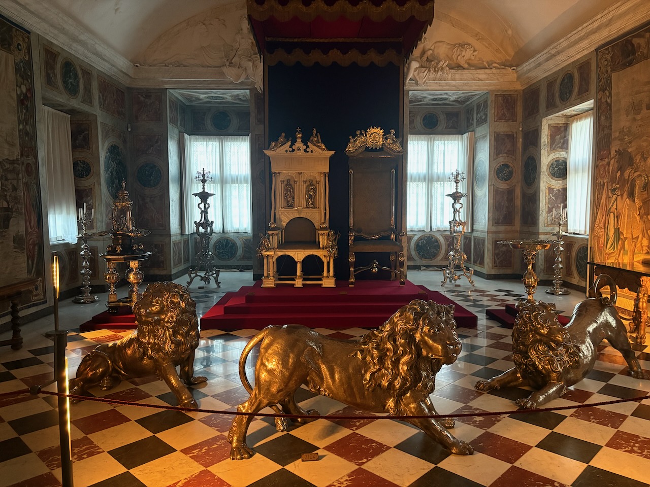 Thursday morning we explored the meatpacking district in the rain. I bought an umbrella. Then we went to the Rosenborg Castle, which was full of renaissance odds and ends of the old danish kings. One little room was covered floor, walls, and ceiling with dark mirrors. It felt ghostly. In the basement we saw the treasure room.